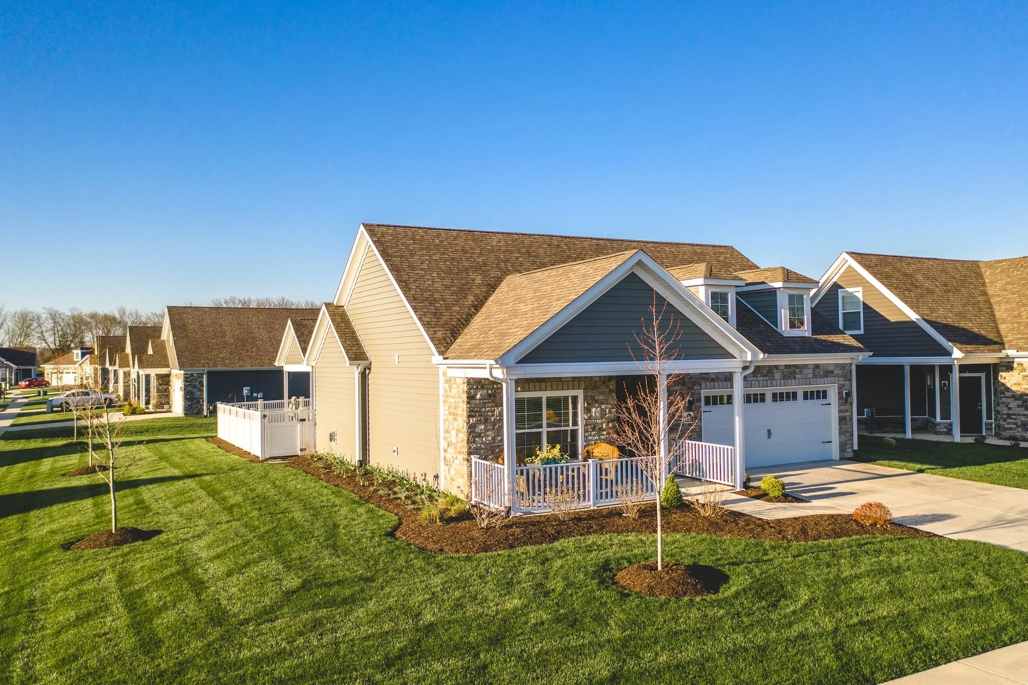 A row of modern suburban houses with well-maintained lawns and young trees under a clear blue sky.