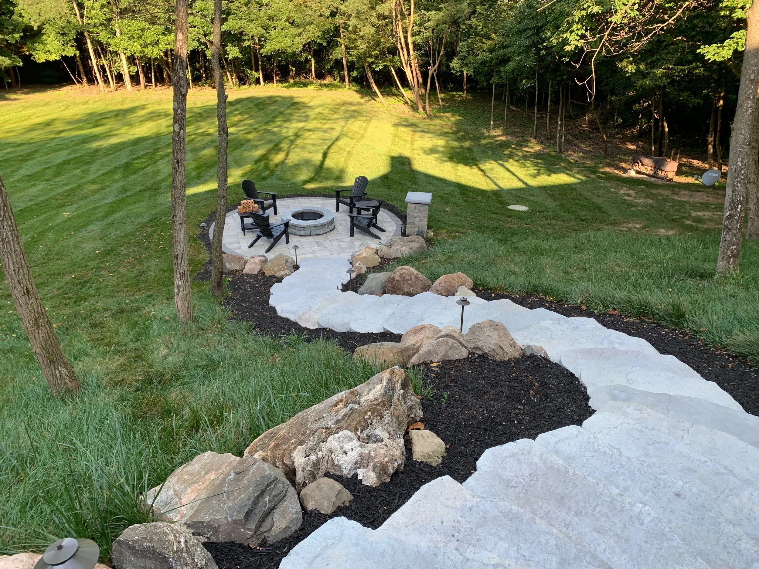 Backyard with a stone pathway leading to a circular patio with four black Adirondack chairs around a fire pit, surrounded by trees and grassy area.