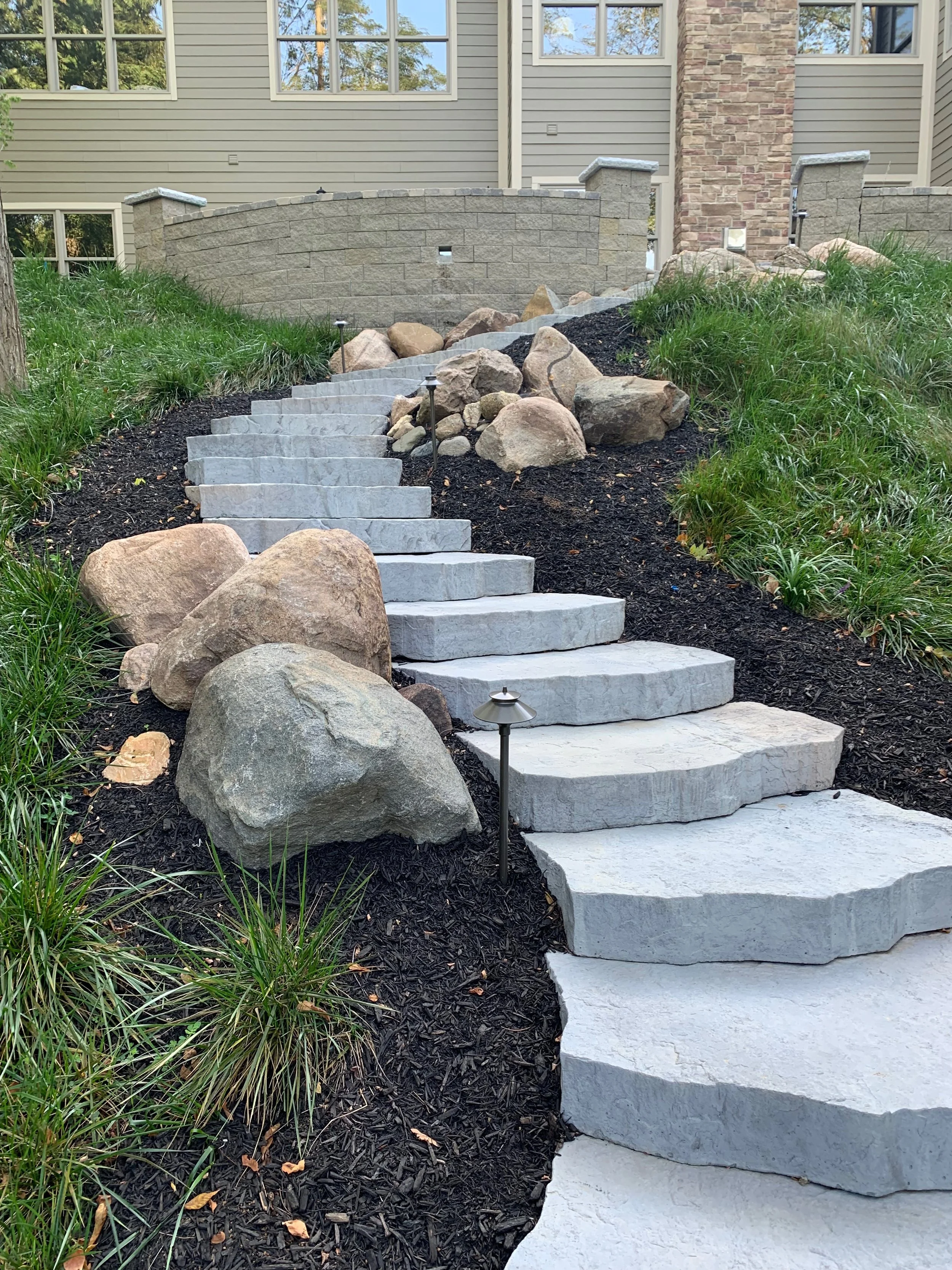 Stone and concrete staircase leading up a hillside with landscape lights, large rocks, green grass, and a house with siding and windows in the background.